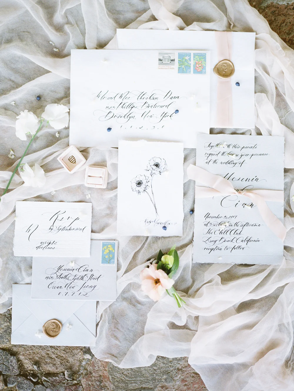 Photography: Jeremy Chou | Styling and Planning: Chloe and Mint | Hair and Make Up: Grace Lin | Floral: Enchanted Garden Floral Design | Gown: Tara Lauren Bridal | Ring: Trumpet and Horn | Calligraphy: Seniman Calligraphy | Model: Maddie Smetana from Willow Models | Film lab: The Find Lab |