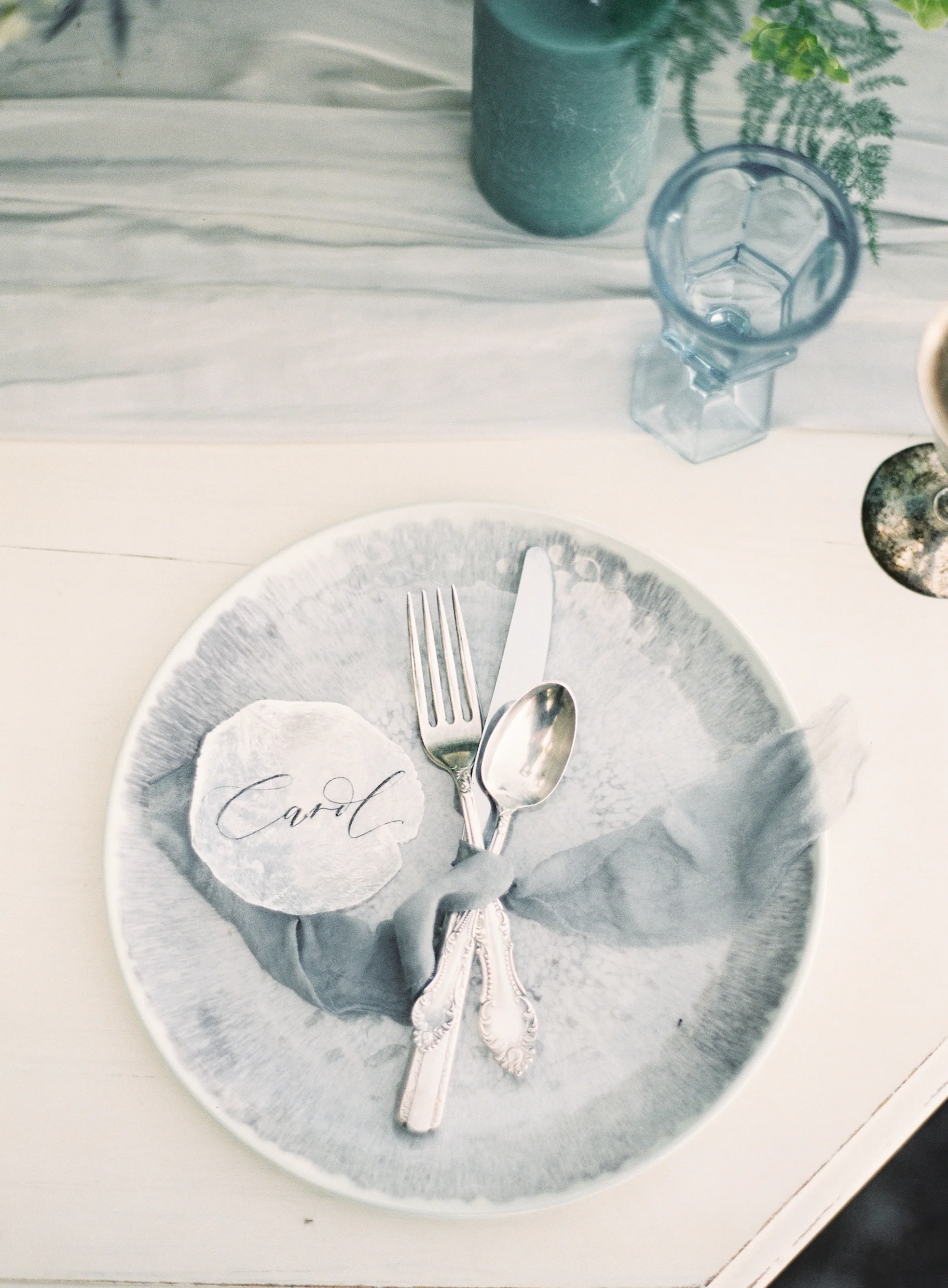 For this handmade invitation suite, I combined handmade watercolor paper from Silk and Willow(they hold up so good with intense watercolor), handmade envelopes from Arpa, and a gorgeous blue handmade envelope from sHare Studios. I used Silver Finetec for my calligraphy against all the blues and an ombre watercolor calligraphy for the main addressing. And of course, we can't forget to add some vintage stamps! And to continue with the coastal theme, I finally got a chance to do some calligraphy on capiz and oyster shells! Yay!!