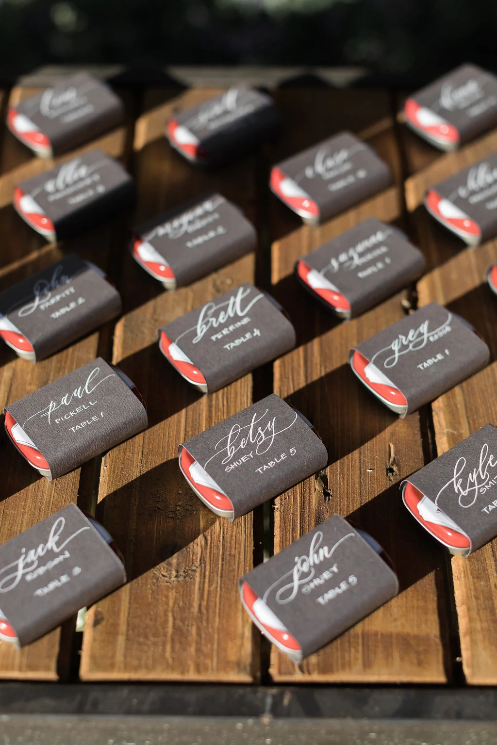 Another unique touch we included in our wedding was our escort cards. When Boyd was planning his proposal to me, he was worried a ring box in his jeans pocket would be too obvious, since he never carries anything in his pockets. He cleverly (thanks to his mom) decided to store the engagement ring in a mini altoid box. So when Boyd got down on one knee to propose (on a birthday wine tasting trip to Healdsburg) he pulled an altoid box out of his pocket! He had even kept all the altoids in there in case I had noticed the mints earlier in the day and asked for one! So we wanted to somehow incorporate mini altoid tins into our wedding day because it had been such a funny memory from our proposal. Our calligrapher, Seniman Calligraphy helped create hand written paper wraps for the mini altoid tins which served as our escort cards, telling each guest where they were sitting. We displayed them all on an antique wooden bookcase. Another special part of our wedding day was our sweetheart table where Boyd and I sat for the dinner reception. My brother, Carter, and dad, Steve, built a beautiful table out of reclaimed Douglas fir that we used for our welcome table and then again for our sweetheart table. It is a memento from our wedding that we will cherish in our home forever.
