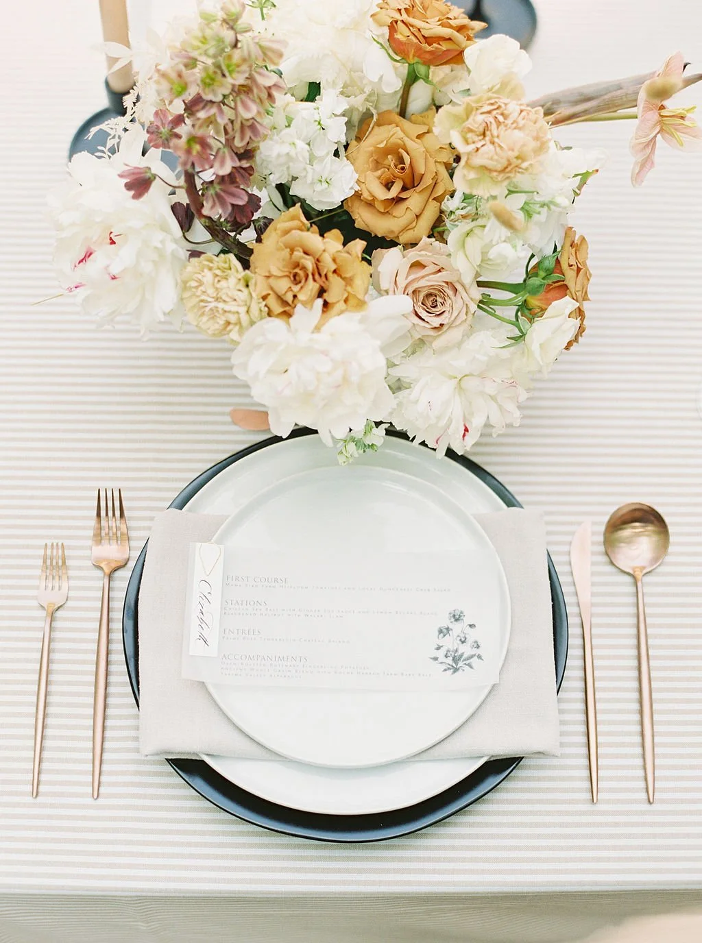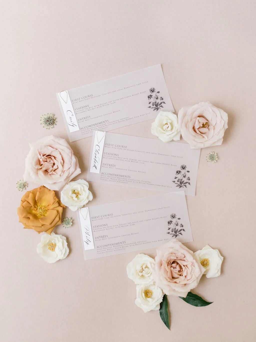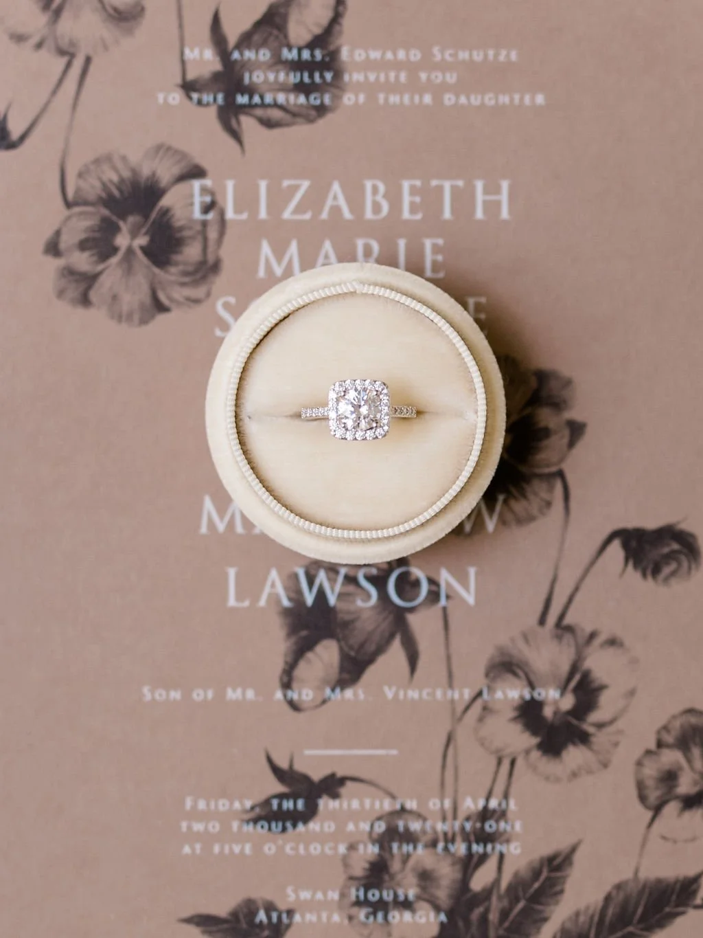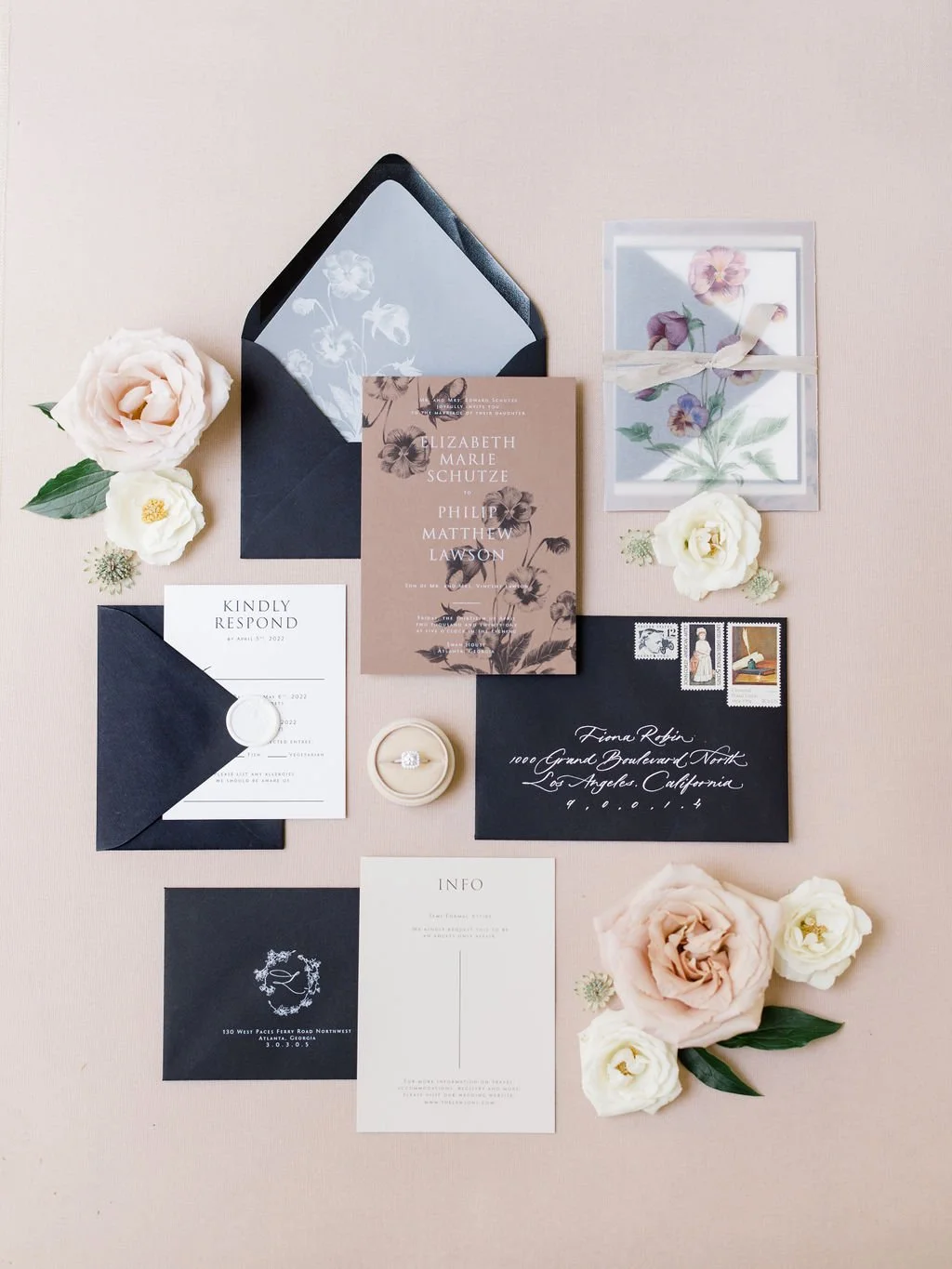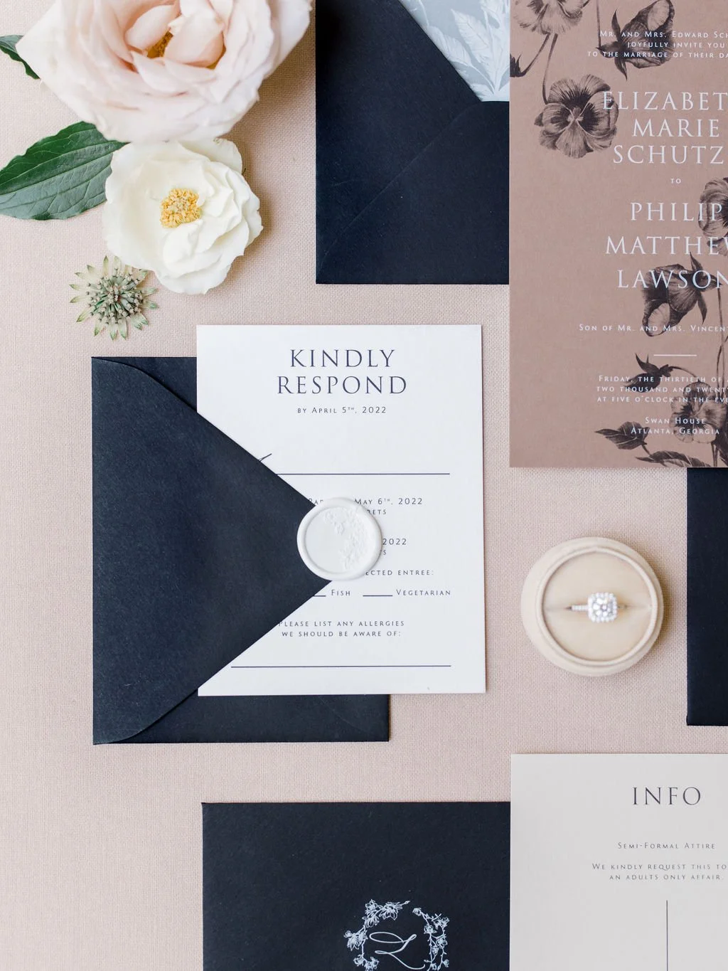 I have Swan House on my wish list for a while, so it’s a definite yes when Tanya Menoni asked for stationery collaboration on this venue. I used this opportunity to do a neutral yet dramatic iteration of my soon-to-be-released 2022 semi-custom designs. With a dramatic black and white color scheme, white Moderne calligraphy addressing, magnolia wreath with a custom monogram on RSVP envelope, vintage stamps, a brown main invitation card with double printing of digital black and digital white, a touch of light taupe, delicate vellum for liners and sleeves, and clean serif typography. I carry the same clean design on vellum with Moderne calligraphy for the menus and place cards combo.